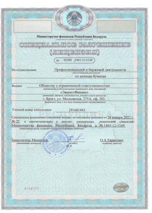 Общество с ограниченной ответственностью "ЭВЕРЕСТФИНАНС" Профессиональный участник рынка ценных бумаг. Специальное разрешение (лицензия) Министерства финансов Республики Беларусь на право осуществления профессиональной и биржевой деятельности по ценным бумагам № 02200/1401-12-1169. Специальное разрешение (лицензия) выдано на основании решения от 26 января 2021 года № 22 и зарегистрировано в реестре специальных разрешений (лицензий) Министерства финансов Республики Беларусь за № 1401-12-1169.