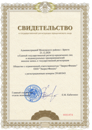 Общество с ограниченной ответственностью "ЭВЕРЕСТФИНАНС" Профессиональный участник рынка ценных бумаг. Специальное разрешение (лицензия) Министерства финансов Республики Беларусь на право осуществления профессиональной и биржевой деятельности по ценным бумагам № 02200/1401-12-1169. Специальное разрешение (лицензия) выдано на основании решения от 26 января 2021 года № 22 и зарегистрировано в реестре специальных разрешений (лицензий) Министерства финансов Республики Беларусь за № 1401-12-1169.